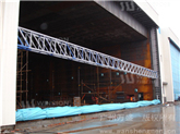 DEM-D1500柔性提升工业门,主要适用于大型库房、涂装车间、小型机库等场合。该门由上导轨、下导轨、上导向轮、下导向轮、主柱、平行四边形铰链机构、PVC帘面、铝压条、拉手等部件组成。上导轨采用标准的工字钢,立柱采用矩形钢管加工制作而成。门体采用双层PVC面料。门体的开启形式为手拉门扇、立柱移动、帘布折叠实现门扇的开启。关闭则反方向操作即可。推拉门扇关闭到位有一锁扣,将门扇位定位。门体具有安全可靠、开启轻便、占地面积小(不需门库)、重量轻、无地轨、结构新颖、抗风压、隔音、保温等特点。
